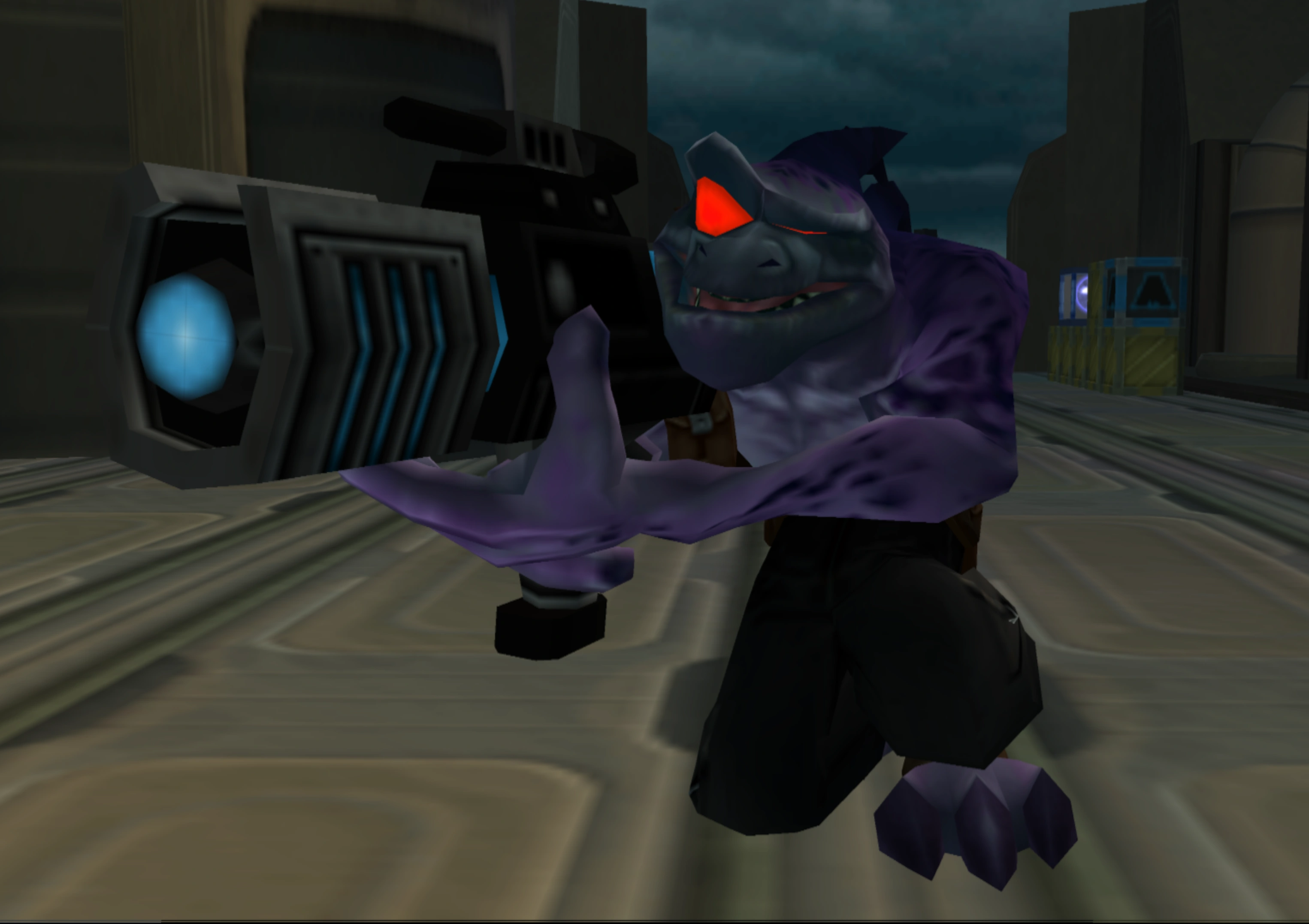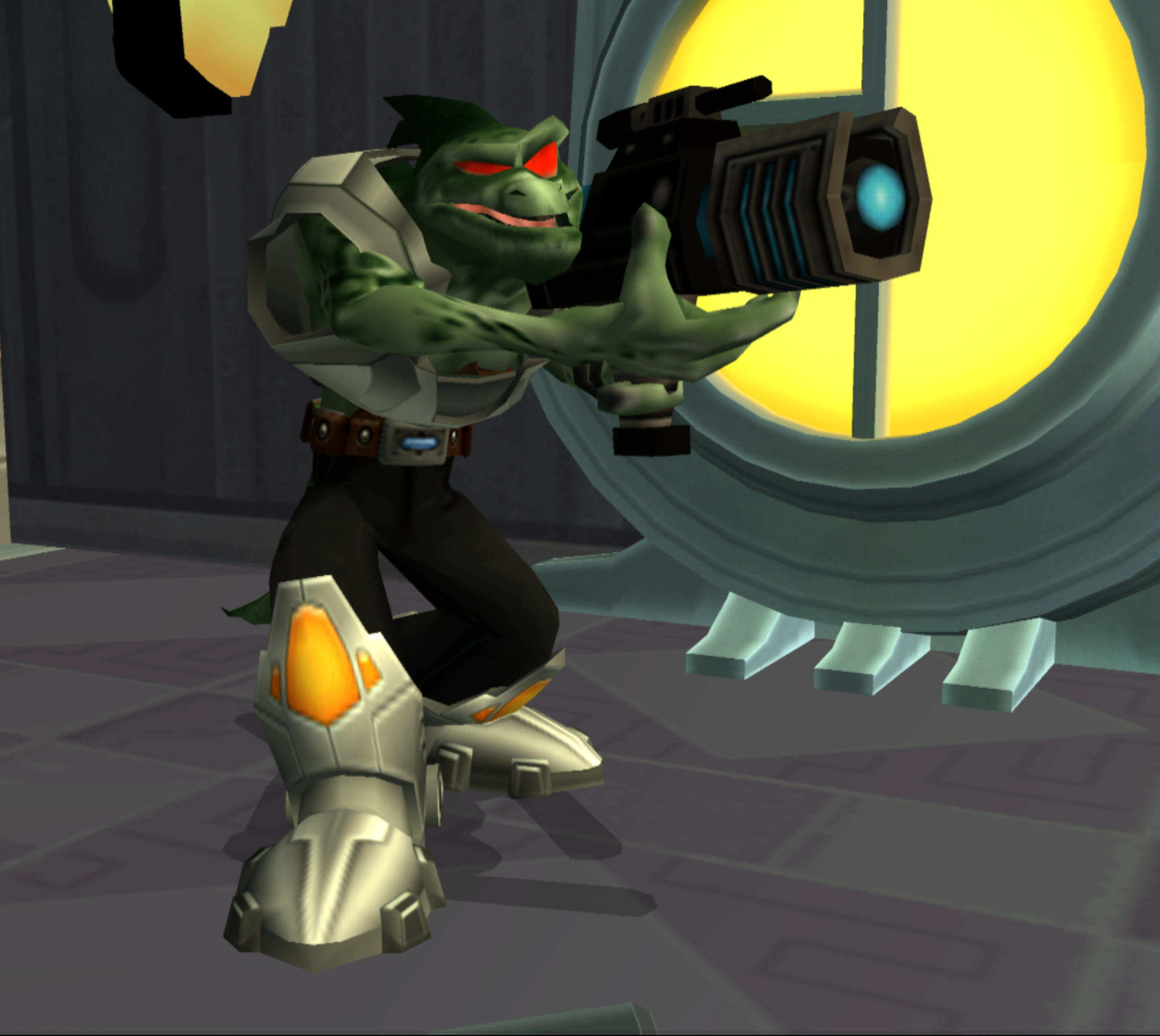 The standard Thugs-4-Less Henchmen have relatively high durability and considerable firepower, and will whack Ratchet with their gun as a melee weapon if he comes too close. It is easy enough to predict the trajectory of the electric sphere fired from their blasters, making dodging or avoiding them altogether quite feasible. As they are often encountered in groups there is good reason to rely on weapons that need less assistance during aiming. This means that the Chopper and Blitz Gun are effective against them, while the Seeker Gun is useful against those fought individually. The Miniturret Glove and Synthenoids are also powerful for extra firepower.