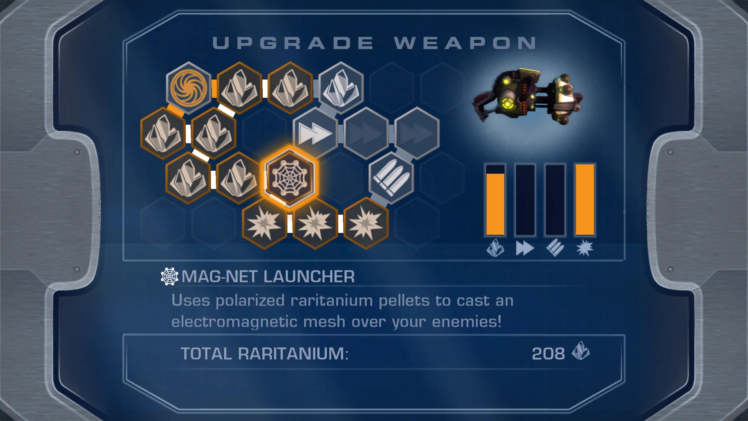 Raritanium upgrades are permanent minor modifications. These include improving a simple base stat such as ammo, damage, range, rate of fire, area of effect, and bolt or raritanium drop rates, as well as a handful of extra unique upgrades specific to only four weapons. Each weapon also has an additional more expensive and unique upgrade that includes an additional upgrade, often akin to power and capability of those acquired at V5.