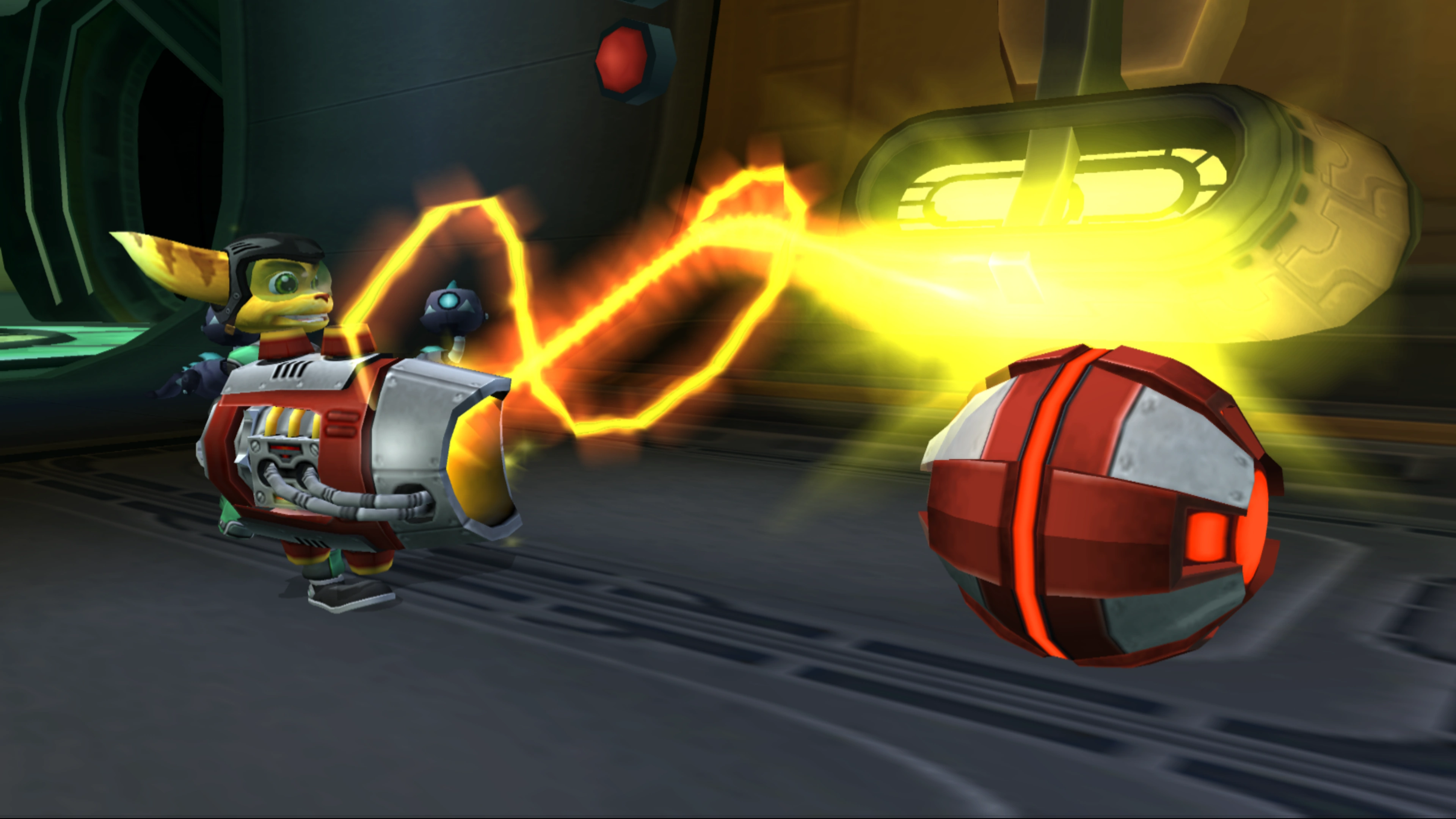 The Tractor Beam can manipulate any object with an orange target signal. This allows Ratchet to use the Tractor Beam on the object and then move it around with as he pleases. Aside from moving around pillars for Ratchet to jump on, it can also be used to move small, round bombs around to destroy obstacles, and later to fight the Mutant Protopet. Another use for it is to move around Inspector Bots, which are plump, red, humanoid robots, which have clearance to certain areas for inspection. The Tractor Beam can move these Inspector Bots onto the platforms to grant immediate clearance and open doors or access elevators.