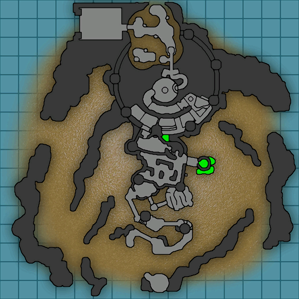 A long partially flooded tunnel must be traversed using versa-targets to reach a tunnel, this time seemingly naturally formed, until a large circular room is reached. Said room is flooded as well, with a pillar in the center and buttons on the top, which if activated will open a door on the other side. Above the platform hangs a strange device, that appears to be some sort of massive claw, with 'fingers' extending outwards into the four cardinal directions, before curling inwards.