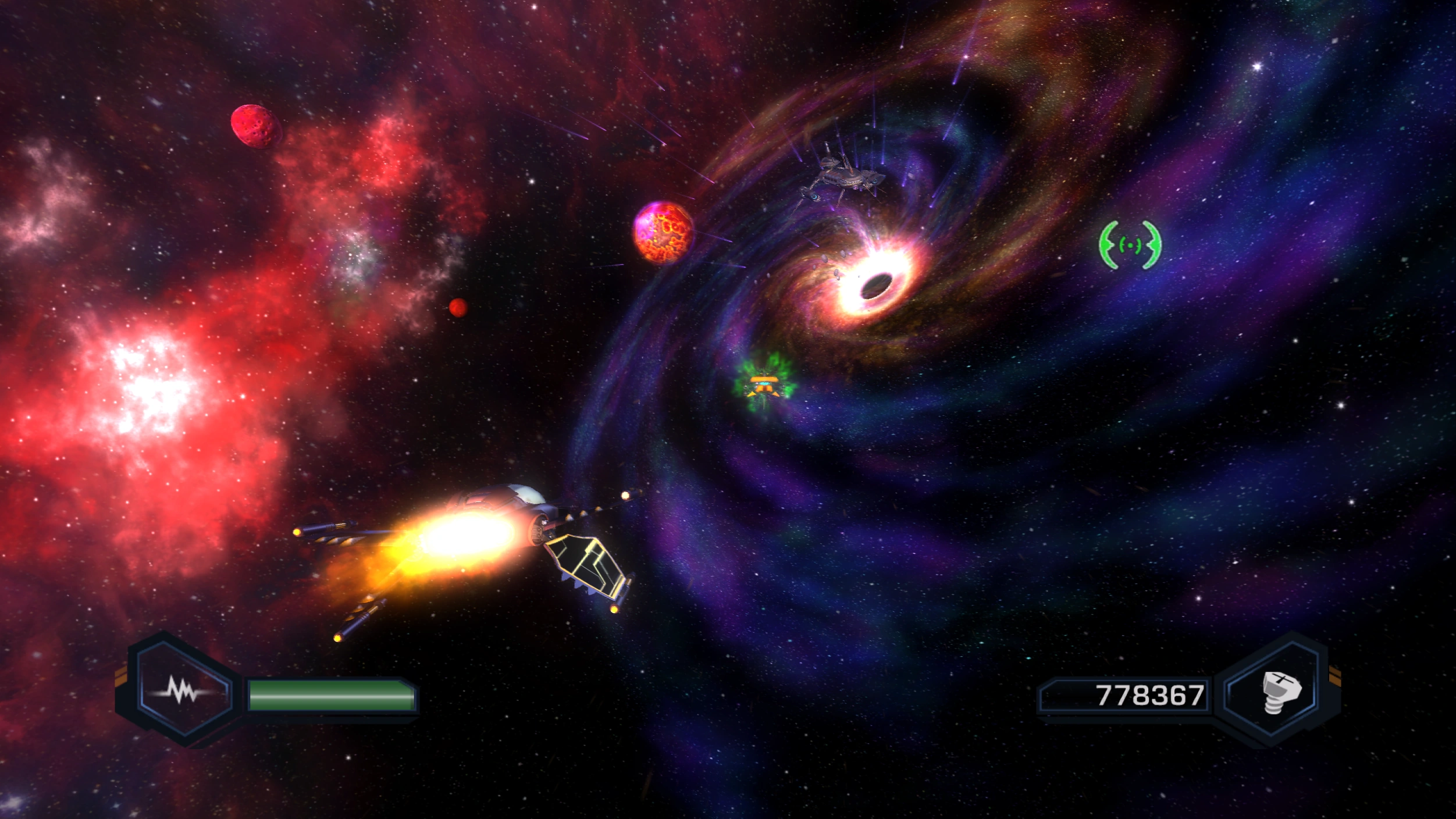 Ratchet and Clank, piloting Aphelion, flew past the Verdigris Black Hole on their way to Jasindu for the Dimensionator. Captain Slag sent ships to intercept them, seeing that they were headed for Jasindu and deducing that it must be the location of the Dimensionator (known to them as the "Lombax Secret"). Ratchet suggested flying through the black hole, much to Clank's terror, to evade them, but decided to destroy Pegasus Outpost on the way. After Aphelion flew through the black hole, using a proto shield to survive, the pirates carried onto Jasindu for the Dimensionator and left Greasepalms McGee to fight them inside the black hole.[1]