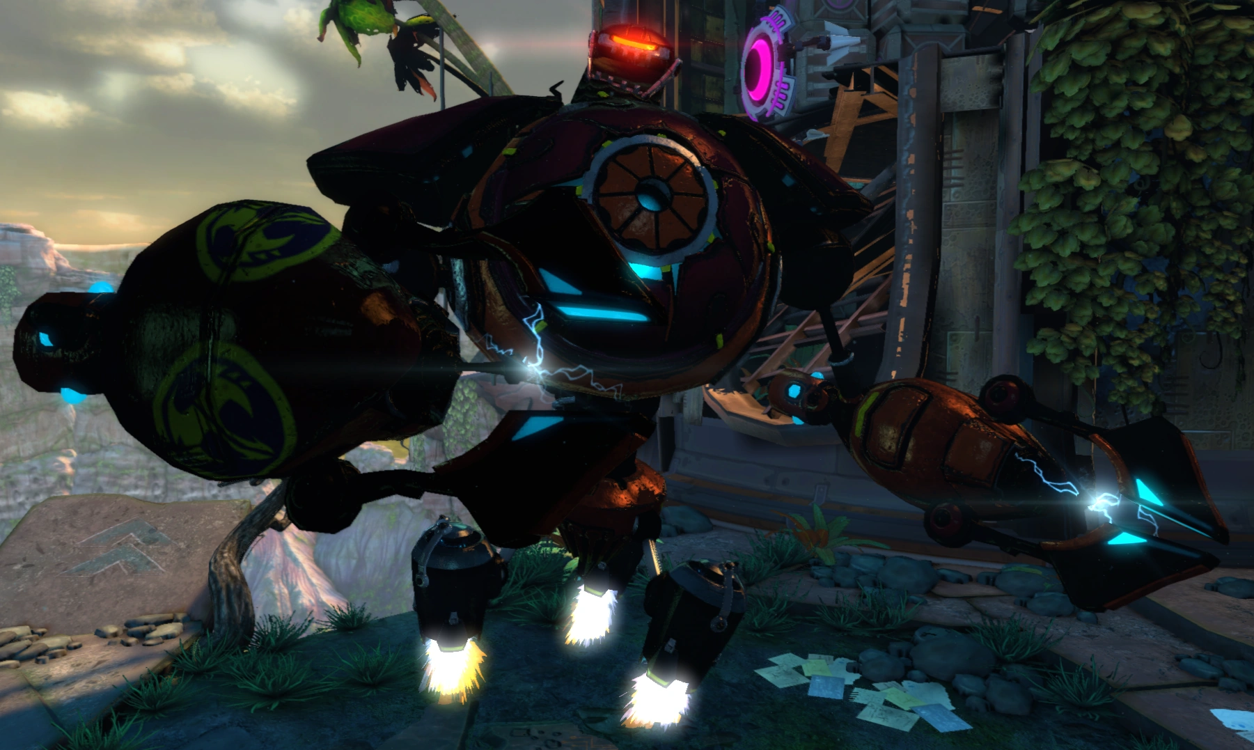 Voltanoids continue the "giant flying torso" design staple introduced in Going Commando with the Megacorp Robot Guard. This concept was designed by Insomniac Hames developer Colin Munson as a simple enemy design to save time and was internally known as the "flying robot torso".[4]