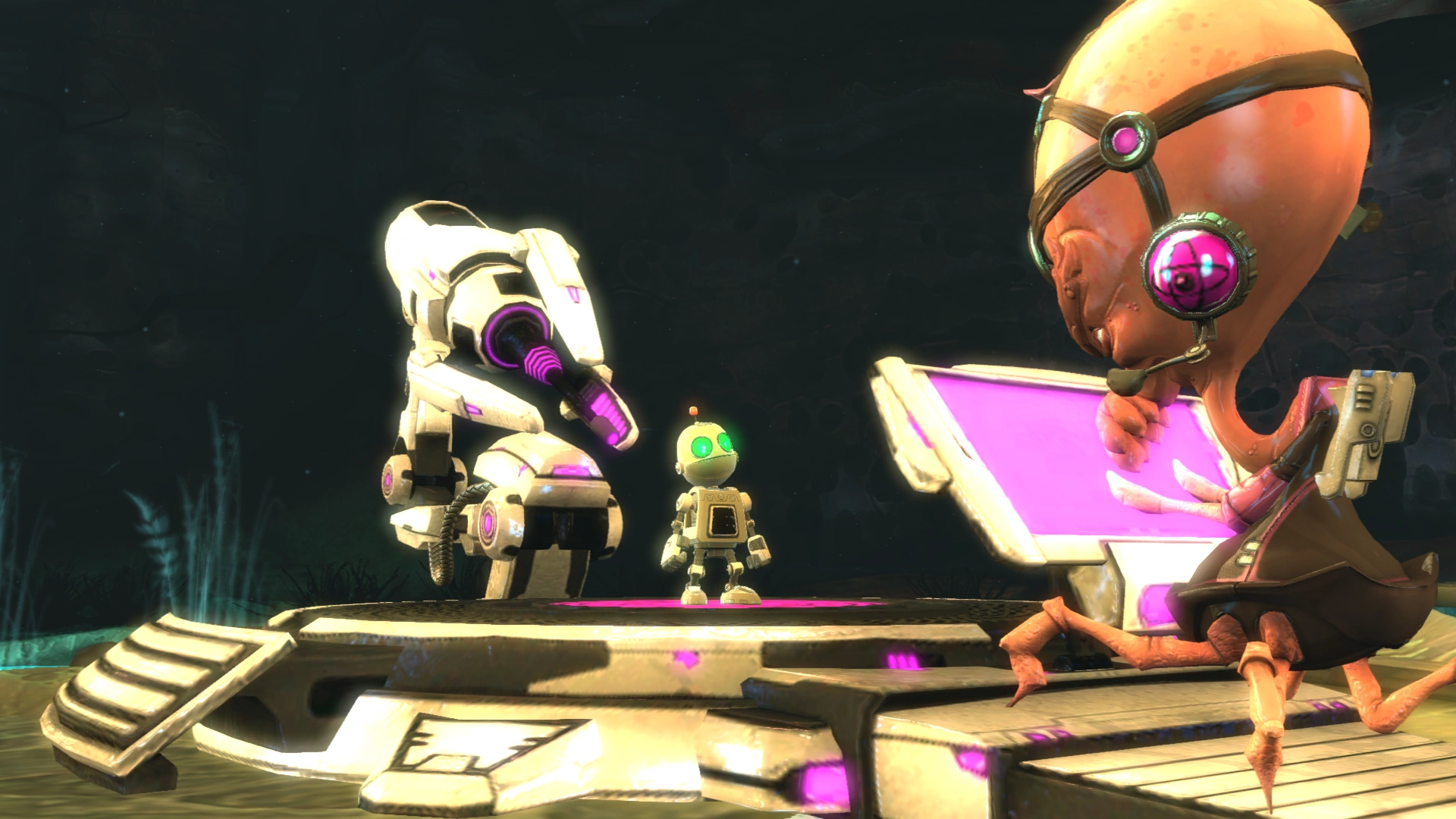 Pollyx installing the Rift Cracker upgrade onto Clank.